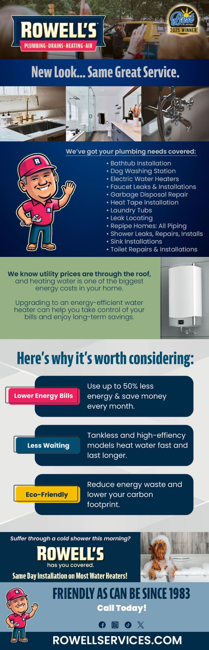 "Friendly As Can Be Since 1983!" When you need help with your plumbing, drains, heating, cooling or electrical in Auburn, you can always rely on Rowell's Services! Call us now or book online!