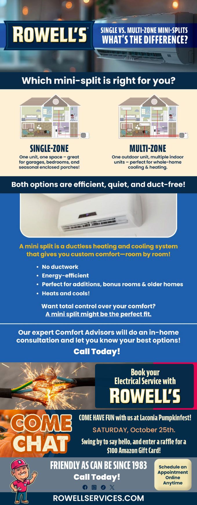 "Friendly As Can Be Since 1983!" When you need help with your plumbing, drains, heating, cooling or electrical in Auburn, you can always rely on Rowell's Services! Call us now or book online!